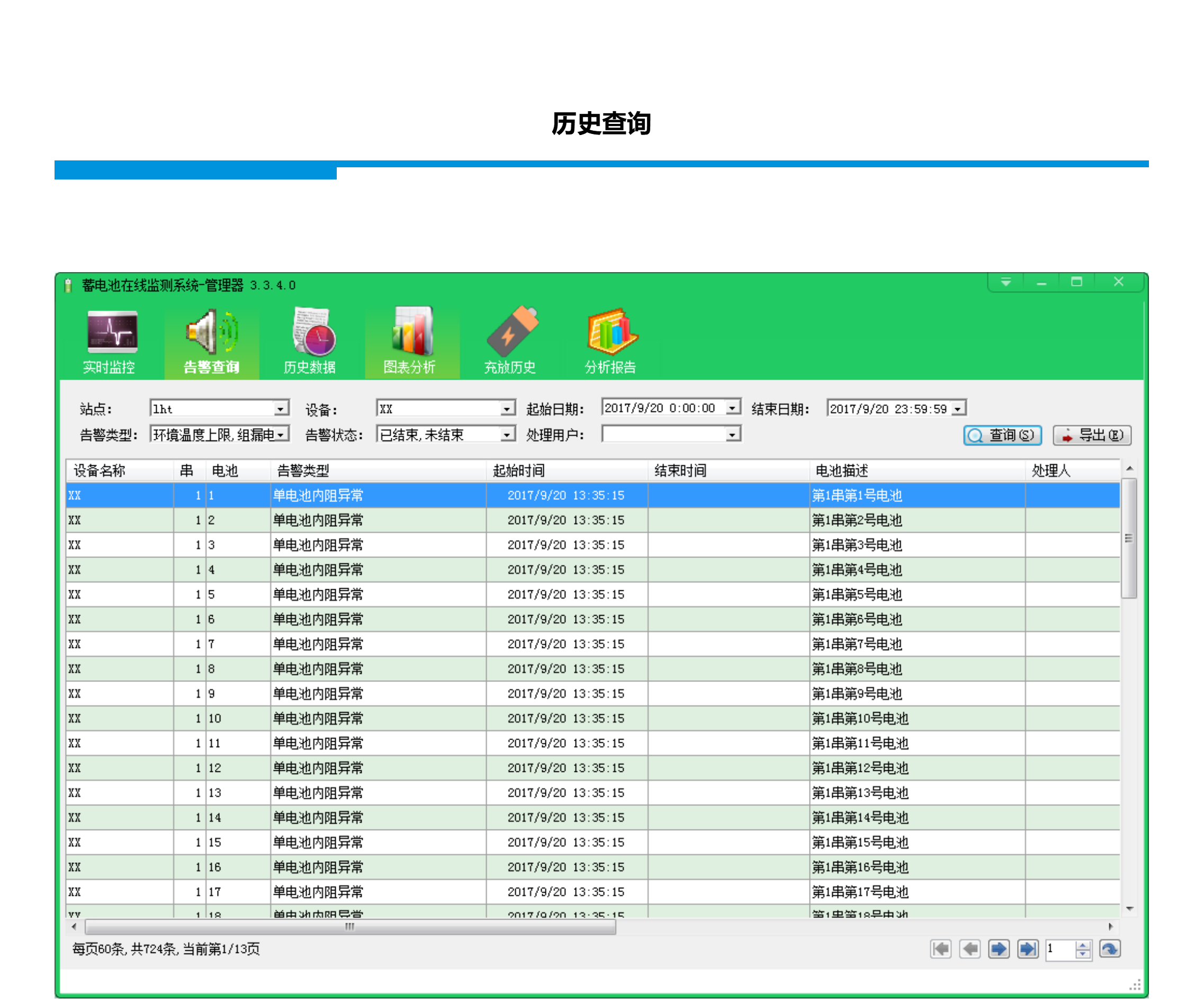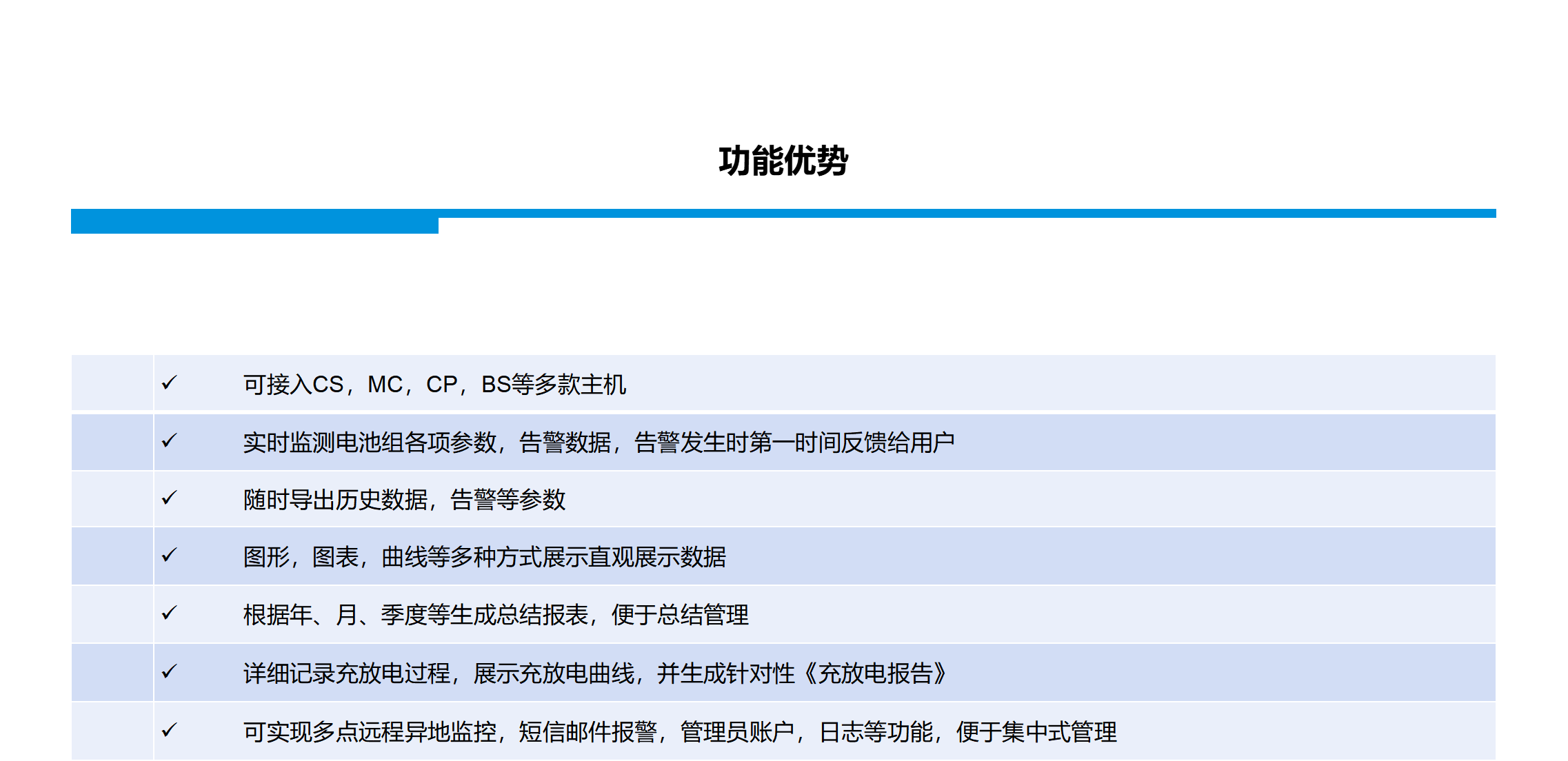 2.實時監(jiān)測電池組各項參數(shù),告警數(shù)據(jù),告警發(fā)生時第一時間反饋給用戶
